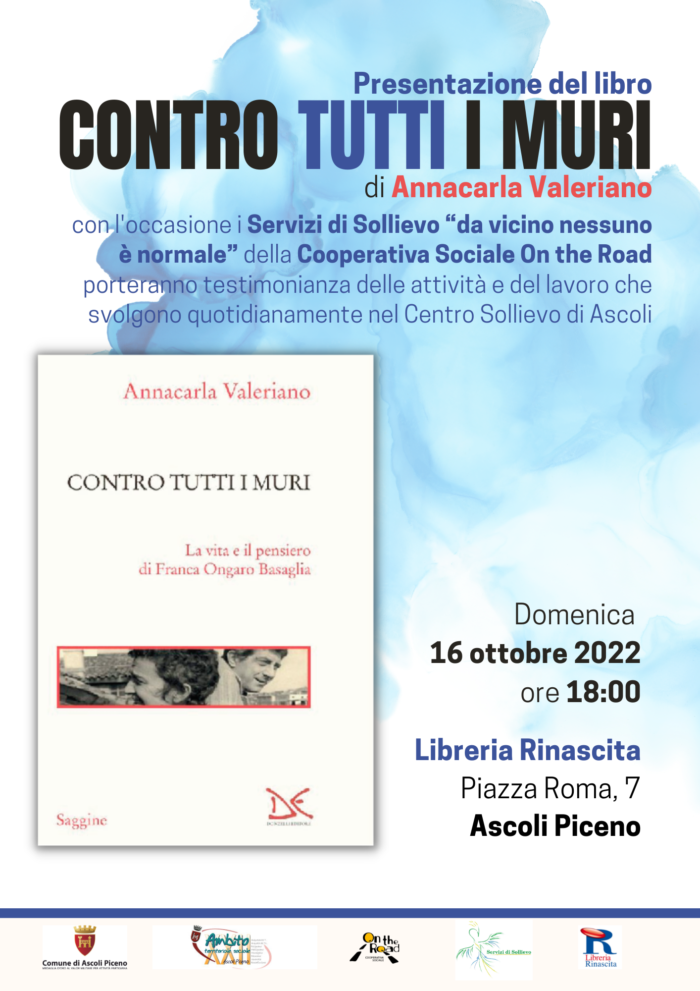 Domenica 16 ottobre 2022, alle ore 18:00 presso la libreria Rinascita di Ascoli Piceno, si terrà la presentazione del libro di Annacarla Valeriano “contro tutti i muri”, in collaborazione con i Servizi di Sollievo “da vicino nessuno è normale” della Cooperativa Sociale On the Road che con l’occasione porteranno testimonianza delle attività e del lavoro che svolgono quotidianamente nel Centro Sollievo di Ascoli.